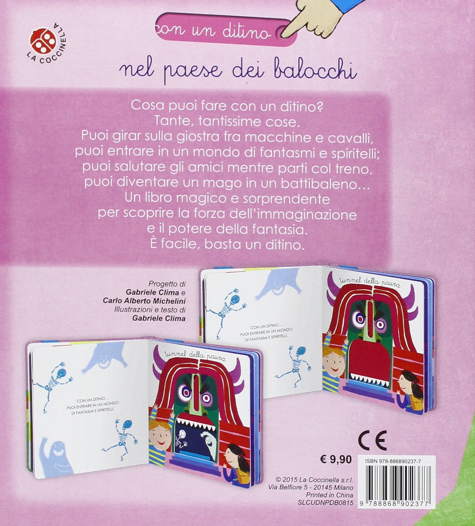 Questi libri della serie con un ditino sono veramente belli e geniali. Il bambino mette un ditino in una casellina e spostandola, lungo un piccolo tratto predefinito, comporta una modifica nelle illustrazioni della pagina del libro, cosa paritcolarmente geniale, dal momento che le immagini di un libro, di per sè, non potrebbero cambiare.